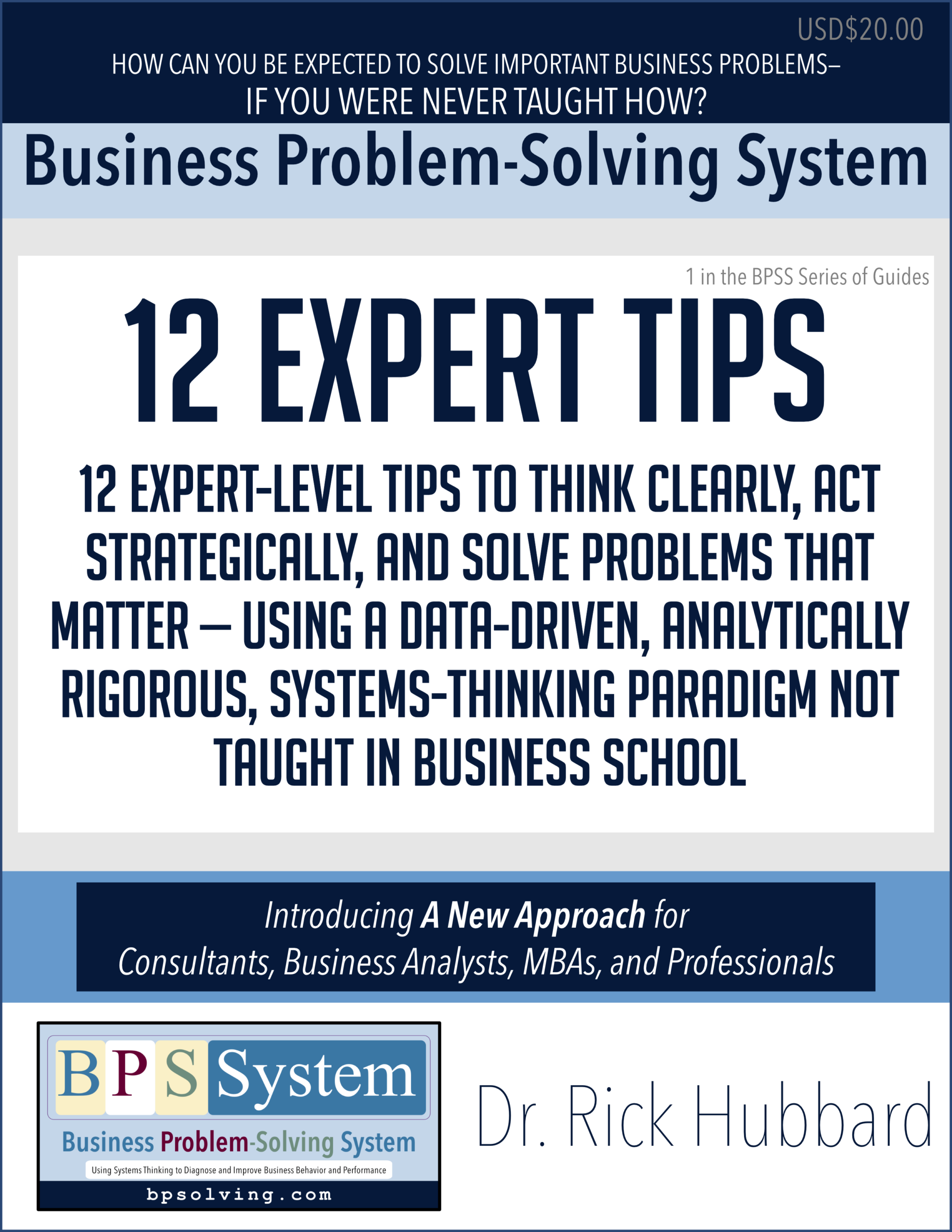 12 Tips to Think Clearly, Act Strategically, and Solve Problems That Matter — Using a Data-Driven, Analytically Rigorous, Systems-Thinking Paradigm Not Taught in Business Schools. This free Guide introduces the Business Problem-Solving System (BPSS) to management consultants, business analysts, MBAs (and MBA students) by providing a dozen insightful & novel systems-thinking-based business problem diagnostic and solving tips. Learn how to improve business behavior and performance by authoritatively looking beyond symptoms to systematically diagnose actual, non-visible & non-obvious causes, and craft critical ‘causally-linked & specifically-relevant’ solutions for important business problems. This Guide helps readers bridge the gap from ‘Never Taught’ to ‘Insightful Expert.’ Develop rare, valuable, and difficult-to-imitate skills, knowledge, and insightful abilities that get you noticed and set you apart. Stop guessing. Start solving. Get this free introductory Guide to level up your professional reputation, and accelerate your career.